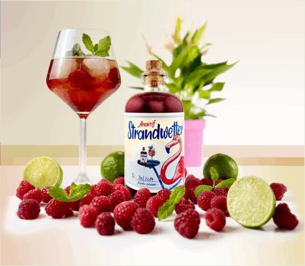 Der Strandwetter ist kein Gin und kein typischer Likör, sondern ein „Aperitif“ aus unseren eigens gebrannten Destillaten, verfeinert mit Schwarzdorn, Himbeeren und Limetten.